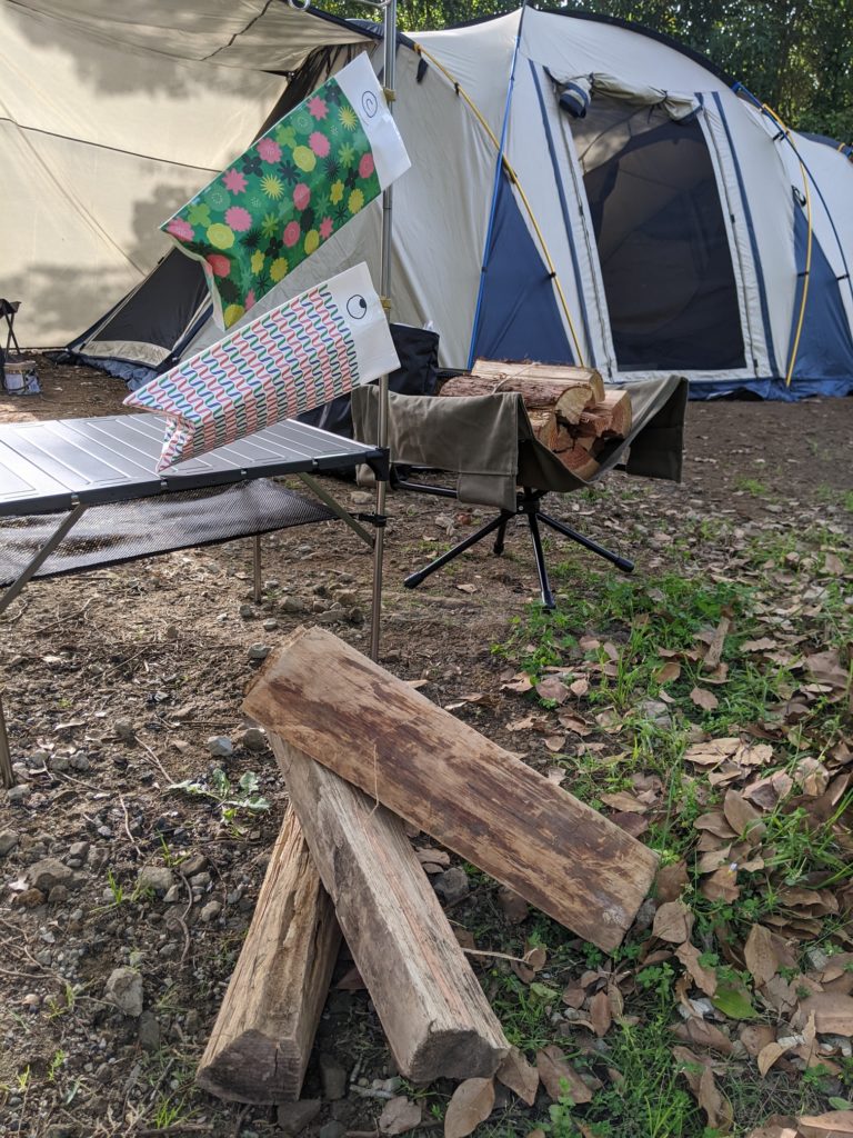 デイキャンプでテント設営は練習してきたからバッチリやね。GWってことでキャンプ場がいろいろイベントやってた(サイトに鯉のぼり飾っておくと薪をプレゼントしてもらえる!これはうれしい)。