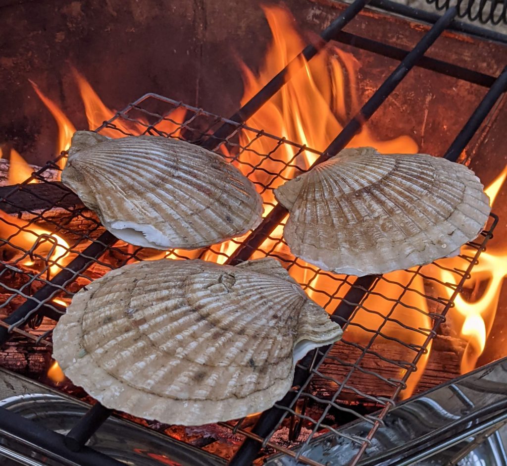 焚き火の準備もできて、最初はどーん、帆立貝!うん、サイコー