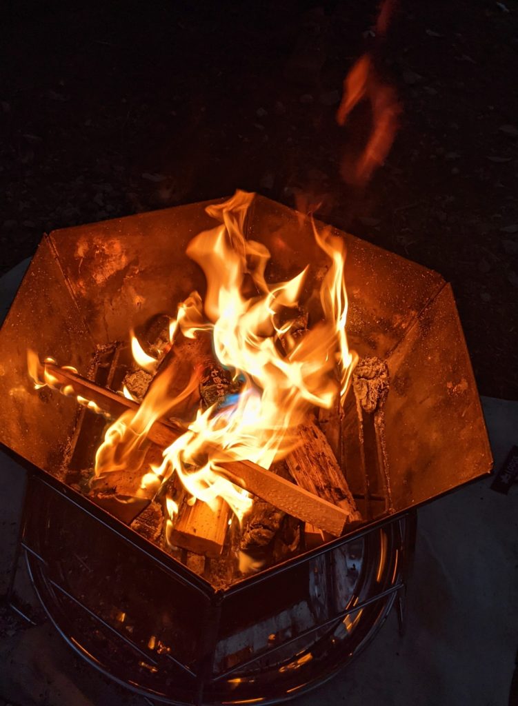 そして、デイキャンプでは絶対味わえない夜の時間。日の落ちたいい感じの時間、焚き火も順調