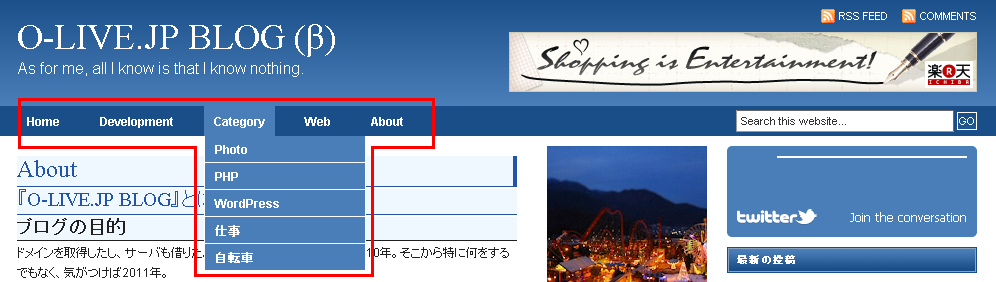 最近のWordPressはこのメニューバーっぽい部分をカスタムメニューとして、ページとは別に設定できるようになったらしい。